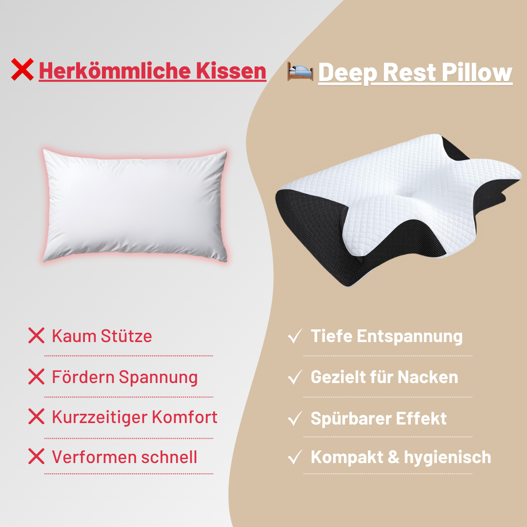 Ein Kissen allein ersetzt keine Therapie, aber es kann viel verändern. Das Deep Rest Pillow hilft deinem Körper, nachts zu regenerieren, weil es die richtige Haltung unterstützt. Das schafft die Grundlage, damit sich Verspannungen mit der Zeit wirklich lösen können.
